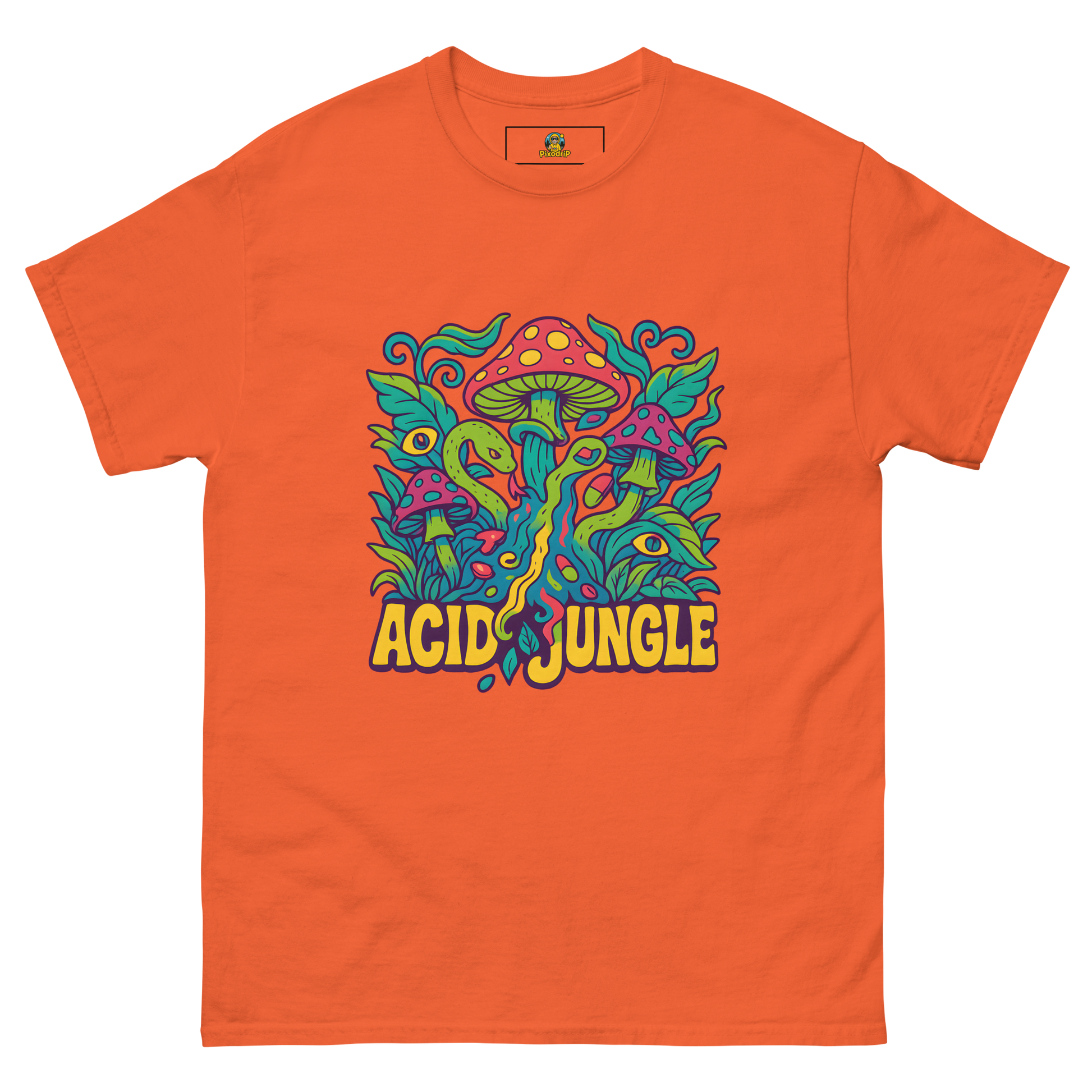 Meet Acid Jungle — a lush forest where serpents slither, eyes peek through leaves, and mushrooms tower like cosmic guardians. Neon vines drip with hallucinogenic energy, creating a wild ecosystem that breathes psychedelia. A tee for explorers ready to lose themselves in the untamed colors of the mind.